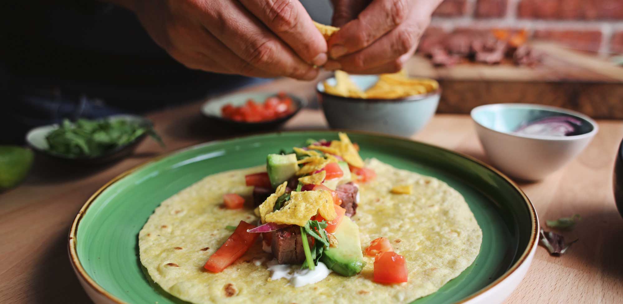 - Etwas Sour Creme auf den Wrap streichen. Dann das Flanksteak darauf verteilen. Nun die geschnittene Avocado, Tomaten, Zwiebel, Koriander, die gegrillte Paprika und den Salat darauf verteilen. Ein paar Nacho Chips zerbrechen und zu den anderen Zutaten geben. Zum Schluss noch ein paar Spritzer Limette auf dem Wrap verteilen.